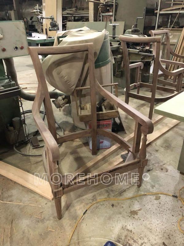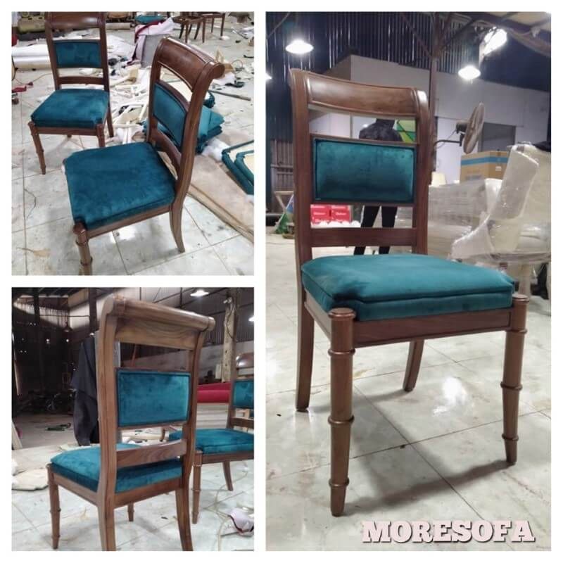 Hình ảnh thực tế ghế ăn gỗ óc chó bọc nỉ cỏ may tại xưởng sản xuất Morehome