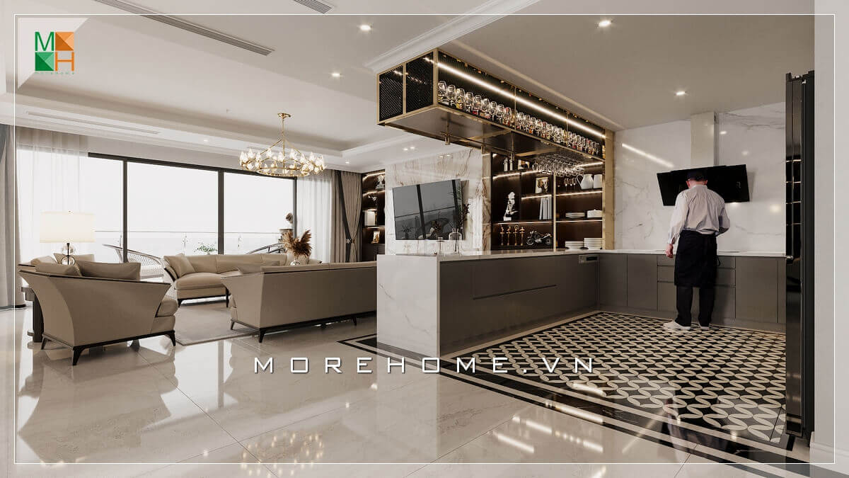 Thiết kế nội thất phòng khách ấn tượng mở rộng với khung cửa sổ to tận dụng ánh sáng tự nhiên từ bên ngoài.